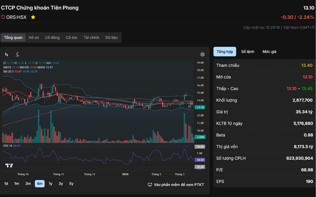 “ORS là cổ phiếu chứng khoán có hệ sinh thái TPBank hỗ trợ, nhưng HIỆU QUẢ KINH DOANH 2025 GIẢM MẠNH (-68.8% lợi nhuận) và ROE rất thấp (2.05%) là điểm đáng lo ngại. P/E 37.29x rất cao so với ngành, nhưng P/B 0.59x cho thấy giá đang thấp hơn giá trị sổ sách.